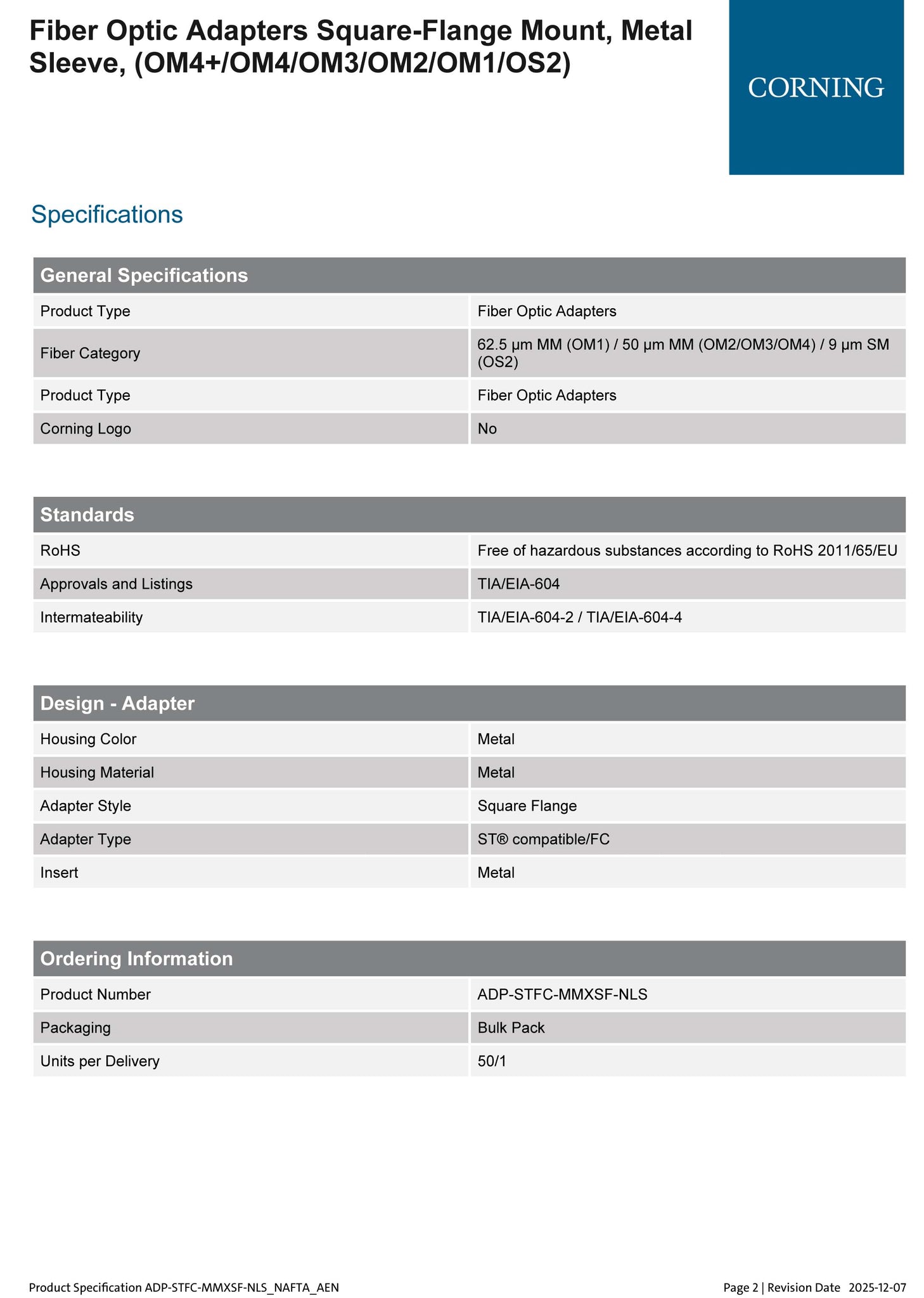 Corning Fiber Optic Adapter Square-Flange Mount Metal Sleeve. (OM4+/OM4/OM3/OM2/OM1/OS2)